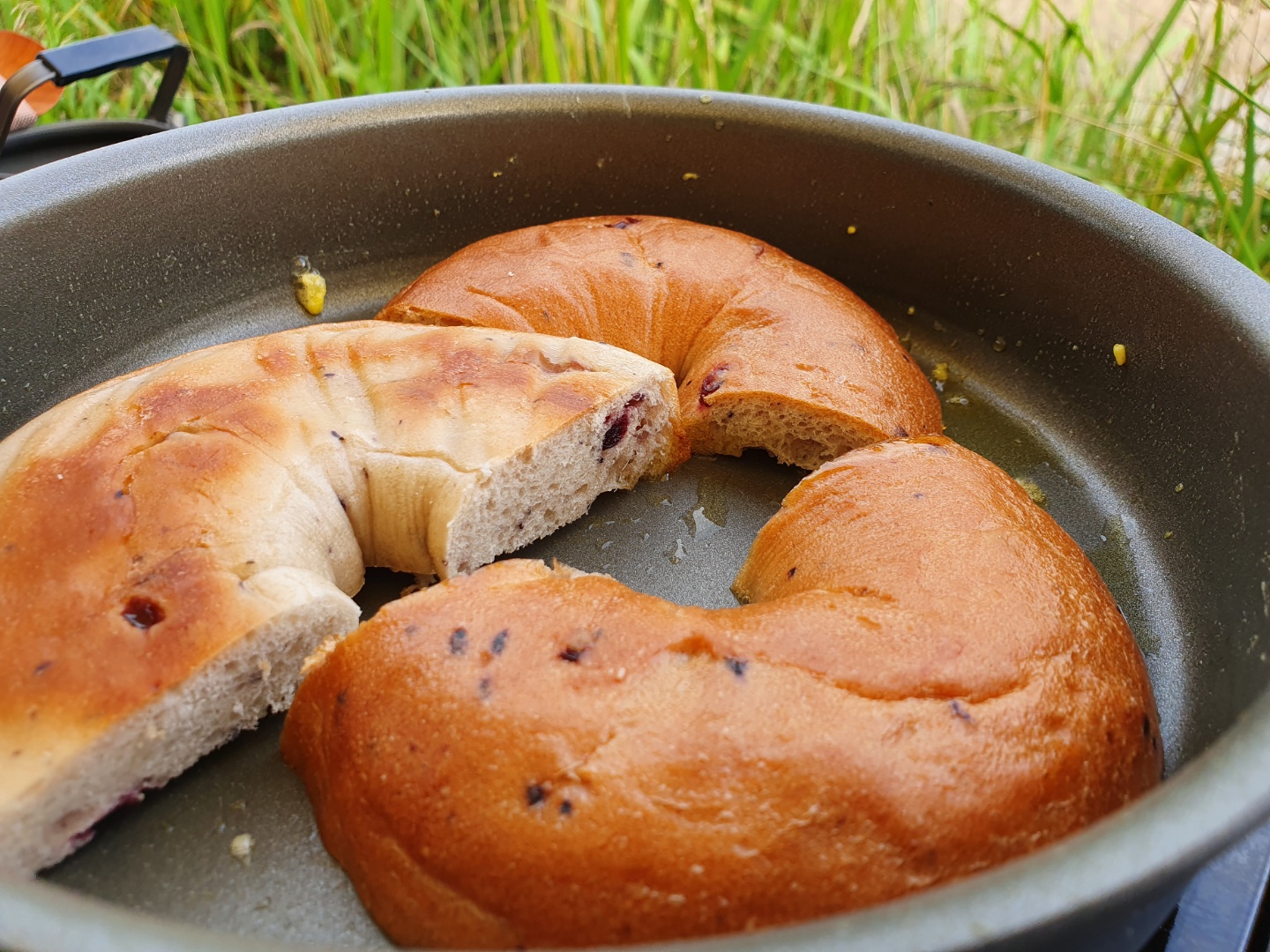 코펠에 올리브유를 두르고 약한 불에 베이글을 살짝 구우면 더 맛있어요~